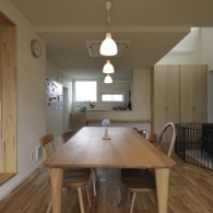 あえてソファは置かず大テーブルでゆったりと。Kさんの希望で冬の主暖房は薪ストーブに