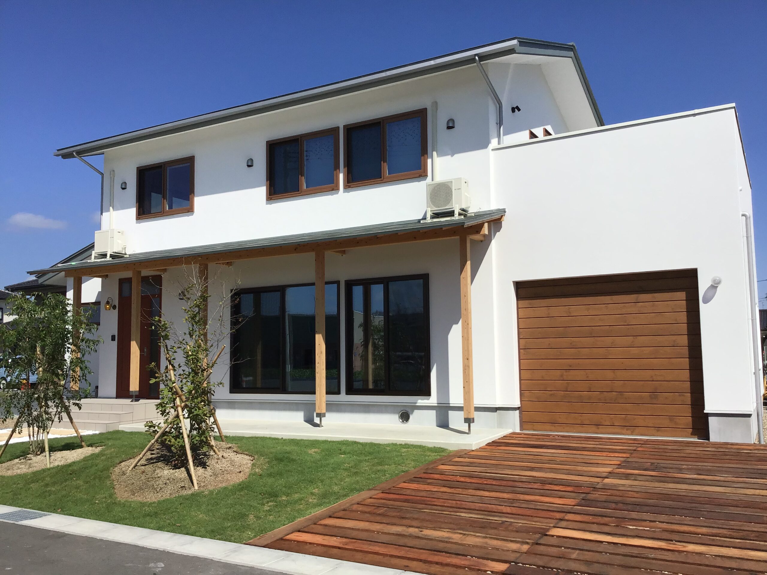 玄関ドア、ガレージのシャッターは木製。白壁が美しく青空に映える