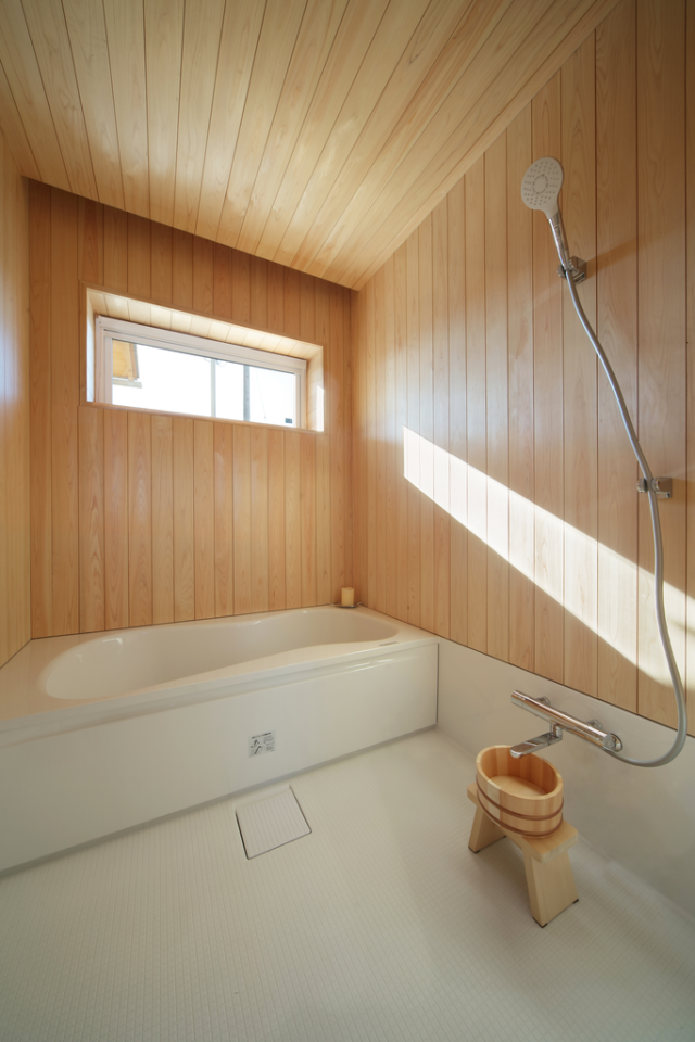 青空に映える眩しい白壁と大きな庇屋根が印象的な住まい。自然エネルギーを取り入れて年中快適に暮らせる、住む人と住まいの健康を考えた「エアサイクルの家」です。外張り断熱を採用し、床下、壁の中、屋根裏に空気を循環させ、建物の温度や湿気を調整するエアサイクルの家。夏は床下と屋根裏に換気口を開けることで、煙突効果により熱気を逃がし、冬は閉じることで冷たい外気の侵入を防ぐため、最小限の冷暖房で年中快適な温度を保ちます。宮城県産材をはじめ自然素材をふんだんに使用した省エネ住宅を多く手掛ける弊社ならではのモデルハウスは、冬も春の陽だまりのような暖かさが体感できるとともに心地よいオープンな空間に満ちた無垢材の優しいぬくもりと清々しい香りに心が解き放されます。壁はほたて漆喰の塗り壁を採用し、浴室は壁と天井にヒノキを使うなど、隅々まで使われた自然素材が心を癒します。雨の日も車を降りて濡れずに家に入れる電動シャッター付きのガレージ、アウトドアリビングとして使える屋上も備えた、遊び心もプラスした住まいです。