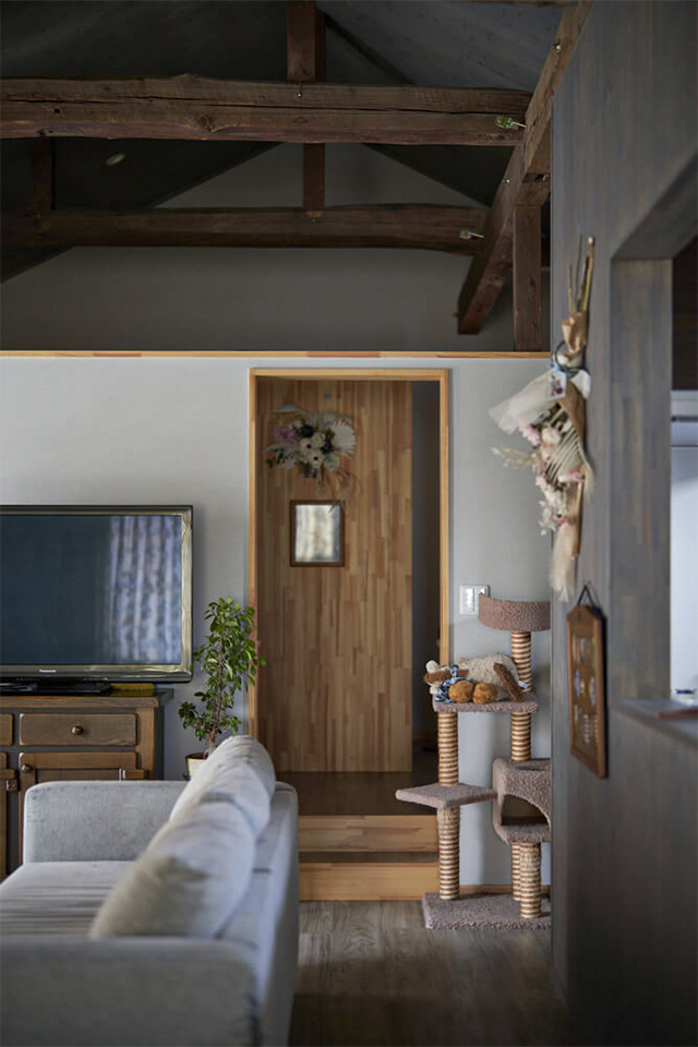 「住み心地が抜群にいいですね。平屋なので全部が手の内にあり、動線に無駄がありません。夫も職場が近くなり、楽になったと思います」と奥さん。広いドッグランでは愛犬が走り回り、家の中では愛猫が梁をキャットウォークに。ご夫妻もペットたちものびのびと過ごしています。