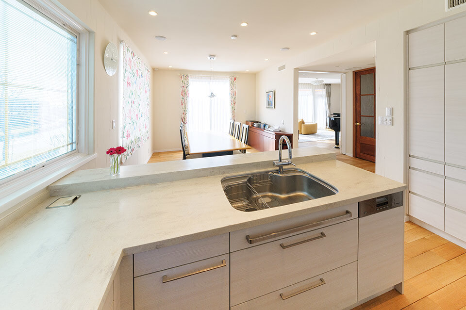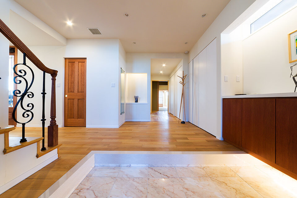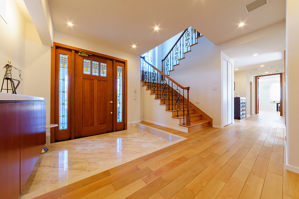 レンガをあしらった洋館風の外観が目をひくこの住まいは、お子さんたちが独立し、夫婦の2人の暮らしを楽しむ家として建設されました。玄関をはじめ、一つひとつの空間ををゆったりとレイアウト。ナラの無垢材や塗り壁など、内装には本物の素材を用いました。中でも力を入れたのが、庭の景色を楽しめる浴室。浴槽は青森の十和田石、天井はヒノキ材と贅沢に仕上げています。ご夫婦がセレクトした素材やインテリアを取り入れ、想いや希望を100%反映させた理想の住まいです。